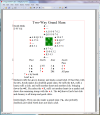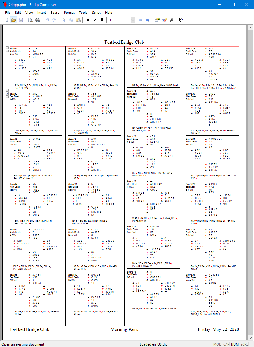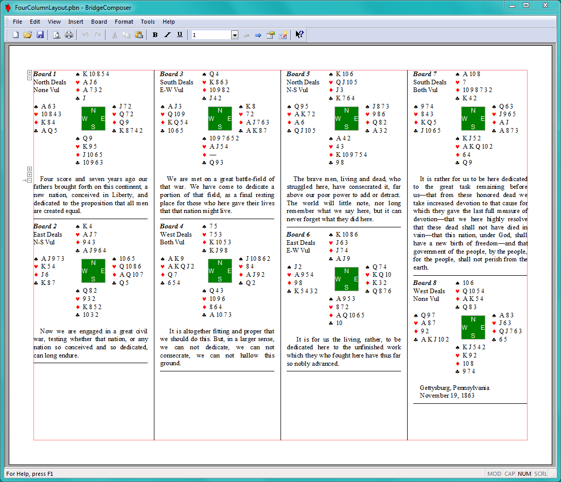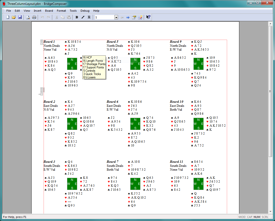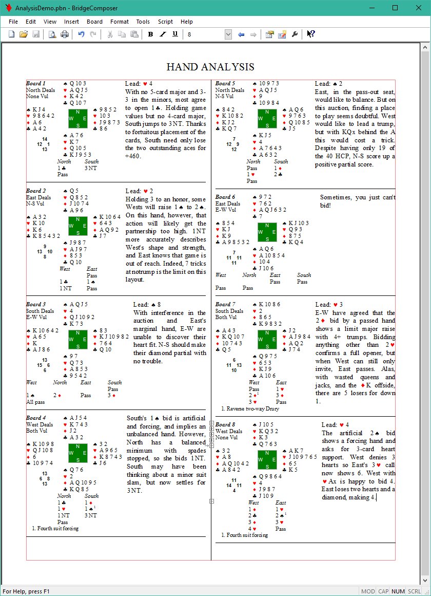Shows eight boards per page. This is accomplished using File→Page Layout to set "Layout" to "As many as will fit, 2 columns" and bottom margin to 0.5 inch; and using Format→Diagram Font to select 8-point font size. The makeable contracts were added using Tools→Double Dummy All Boards. |