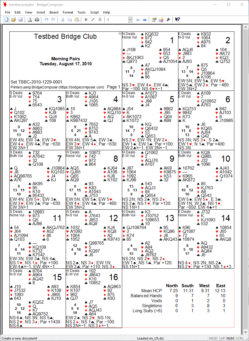 16 boards in player-takehome hand record page layout. Use Tools→Generate Random Boards and/or View→Hand Record Page Layout. See this document as a web page here, and as a PDF file here (Use File→Save As HTML and File→Save As PDF, respectively). |