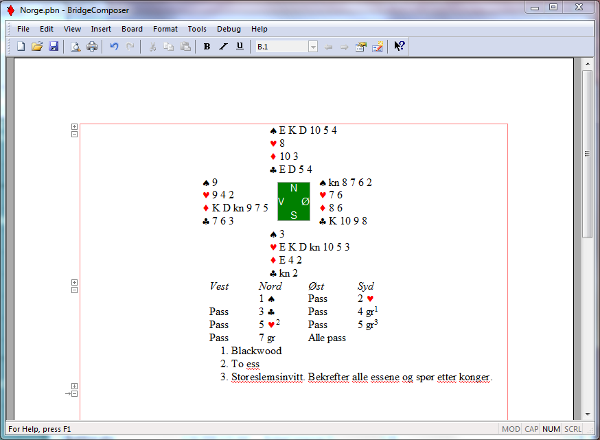 A hand diagram using the Format→Board Layout Translate tab to display in Norwegian. See this document as a web page here. To create a web page (HTML file) from the PBN file, use File→Save As HTML. You may get the message "Unable to open HTML boilerplate file: bplate.htm was not found"; you may either download bplate.htm and try again, or just click "OK". |
