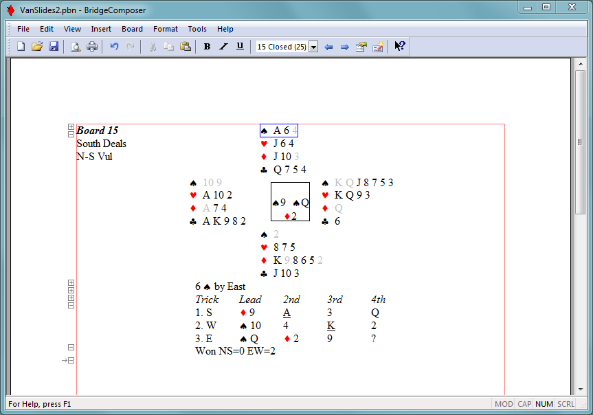 The first board in the document includes a Play section, which shows how play of the hand proceeded card-by-card. The Play section may be created using the "View→Next To Play" menu command (see its Help topic). The second board in the document shows an end-position diagram. Use Board→Edit to see how the card holdings were entered into the Deal field. See this document as a web page here (Use File→Save As HTML). |